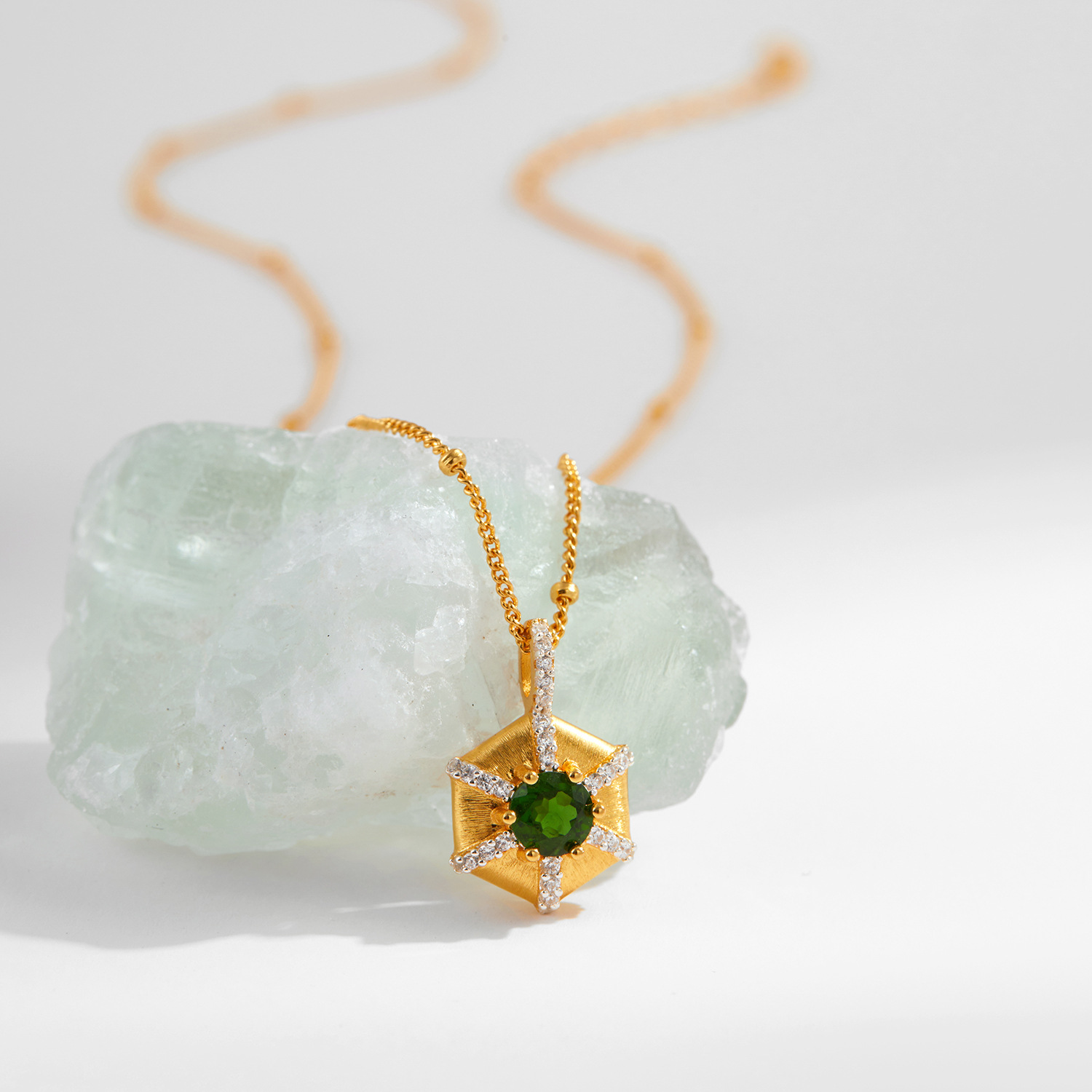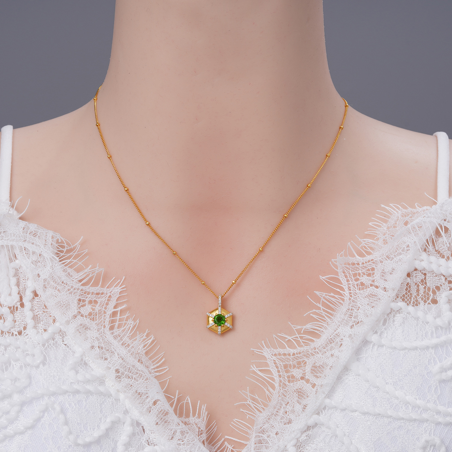& Free ShippingThis necklace centers on minimalist geometric aesthetics, crafted through traditional Italian hand-brushing techniques that create a fine, layered metallic texture on the S925 silver base. The pendant takes on a classic hexagonal silhouette, defined by clean, modern lines. At its heart is set a natural diopside gemstone, whose rich yet limpid emerald-green hue evokes the vitality of early spring leaves, shimmering with a lively glow under changing light.