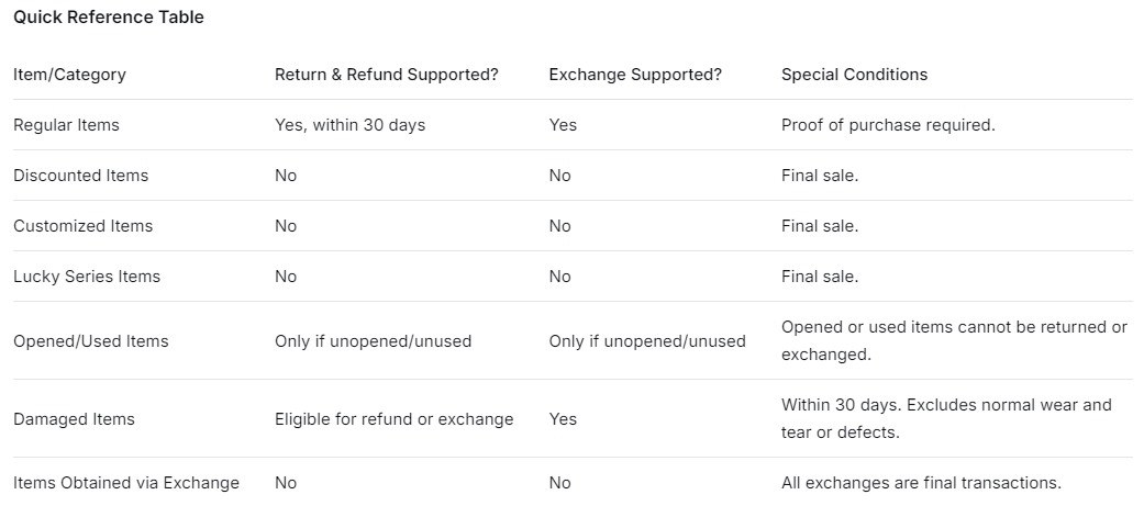 • Due to limited inventory, exchanges for specific items cannot be guaranteed. If the desired item is out of stock, you may choose another item as a replacement.